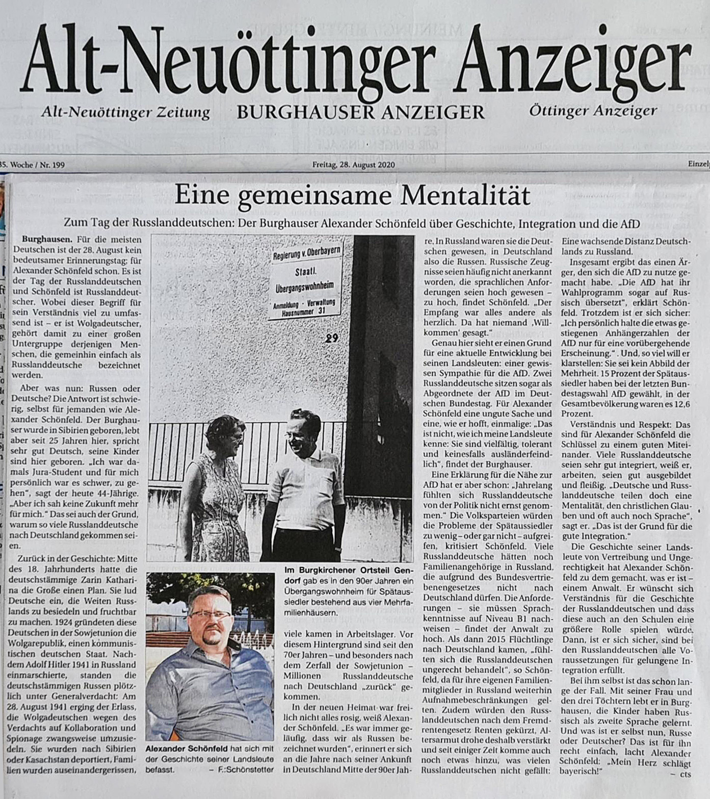 Interview für die Zeitung "Alt-Neuöttinger Anzeiger" vom 28.08.2020