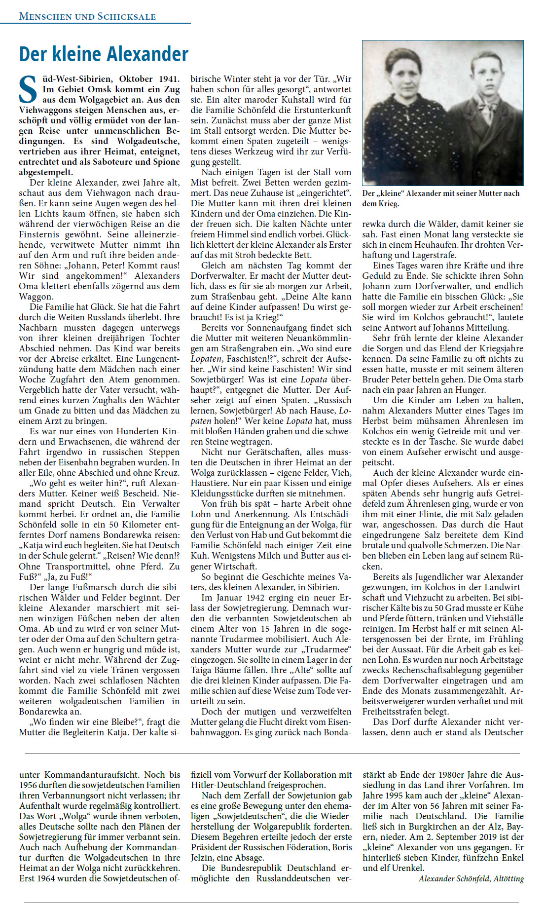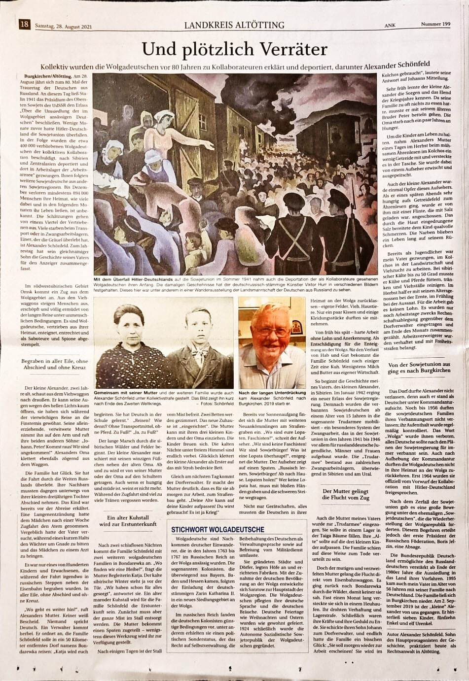 Burgkirchen/Altötting. Am 28. August jährt sich zum 80. Mal der Trauertag der Deutschen aus Russland. An diesem Tag ließ Stalin 1941 das Präsidium des Obersten Sowjets der UdSSR den Erlass "Über die Umsiedlung der im Wolgagebiet ansässigen Deutschen" beschließen. Wenige Monate zuvor hatte Hitler-Deutschland die Sowjetunion überfallen. In der Folge wurden die etwa 400000 verbliebenen Wolgadeutschen der kollektiven Kollaboration beschuldigt, nach Sibirien und Zentralasien deportiert und dort in Arbeitslager der "Arbeitsarmee" gezwungen. Ihnen folgten weitere Sowjetdeutsche aus anderen Sowjetregionen. Bis Dezember verloren mindestens 894000 Menschen ihre Heimat, wie viele dabei und in den folgenden Monaten ihr Leben ließen, ist unbekannt. Die Schätzungen gehen von einem Viertel der Vertriebenen aus. Viele starben beim Transport oder in Zwangsarbeitslagern. Einer, der die Gräuel überlebt hat, ist Alexander Schönfeld. Zum Jahrestag hat sein gleichnamiger Sohn die Geschichte seines Vaters für den Anzeiger zusammengefasst.